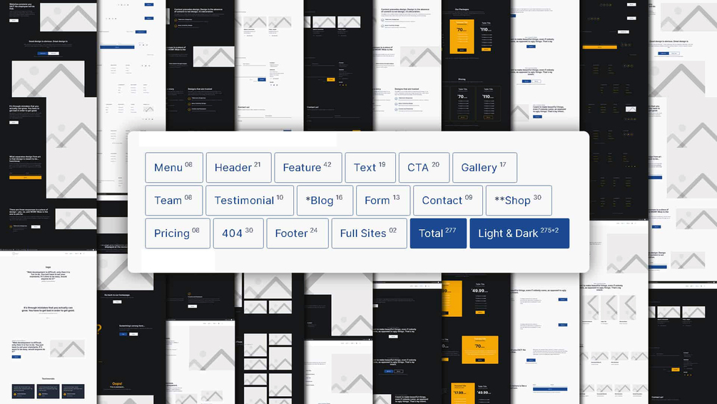 Total layouts / items: 572 designs (light & dark) + 2 Full Sites + 20 Headers